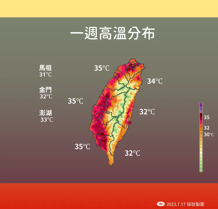 週三(7/19),水氣仍多,偏南至東南風,花東、恆春局部陣雨,西半部地區及各地山區易有午後雷雨;週四至週六(7/20-22),水氣稍減,各地多雲到晴為主,午後局部雷雨,花東偶陣雨,高溫32-35°C,內陸局部36°C以上。