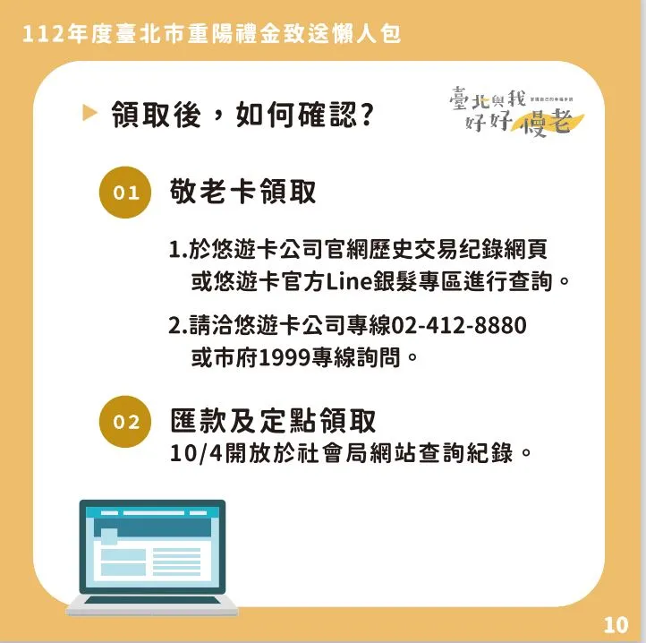 北市重陽敬老禮金致送方式多元又便民,列冊本市低收、中低及中低老津長者將於 8 月 7 日直接入帳至本人帳戶,另一般長者 8 月8 日至 9 月 7 日優先以敬老卡(含註記敬老之愛心卡)可持卡至北市各捷運站悠遊卡加值機、四大超商、美廉社及 101 購物中心 B1 服務台等地點靠卡領取重陽禮金。