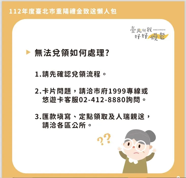 社會局長姚淑文表示,今年市府首度恢復普發長者重陽禮金,除了鼓勵長者以敬老卡靠卡領取外,規劃採多元方式致送,提供長者依需求選擇致送管道,各階段開放不同致送管道,請民眾留意各項致送管道及時間。如有敬老卡靠卡問題,請洽悠遊卡客服 02-4128880 或1999 專線,匯款填寫、定點領取及人瑞親送請洽各區公所。