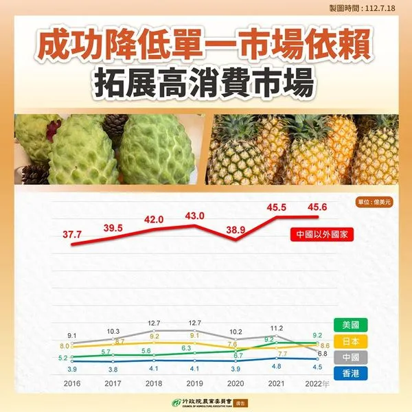 為擺脫單一市場依賴,2022年我國農產品外銷中國大陸以外市場的金額也創下歷史新高,達到45.6億美元,其中美國與日本已經超越中國,成為台灣農產品外銷的前兩大市場。