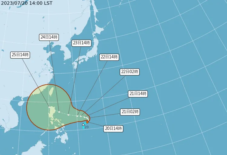 菲律賓東南方海面的熱帶性低氣壓距離台灣約1700公里,以時速16公里向東北移動。氣象局預報員曾昭誠表示,熱帶性低氣壓預計在明日凌晨到上午這段時間增強輕度颱風,在下周日以前,穩定朝菲律賓東方海面過去,不過下周一之後的路徑,各國預測相當分歧,如果高壓強,就會通過呂宋島,高壓弱的話就會更偏東偏北。