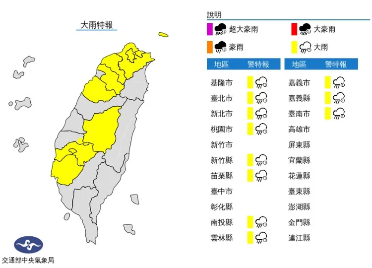 大雨特報影響時間從今日下午到晚上,範圍涵蓋基隆北海岸、台北市、新北市、桃園市、新竹縣、苗栗縣、南投縣、雲林縣山區、嘉義市、嘉義縣、台南市。