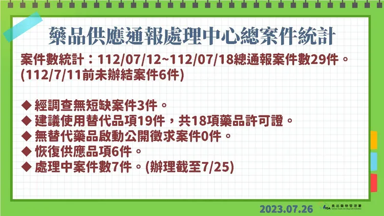 因應國際藥品短缺情形加劇,為避免影響我國藥品供應,食藥署除持續監測相關藥品之供應情形,並請輸入藥品業者,加強監測國外製造廠之生產及供應情形,倘有異常情形,速通報本署。