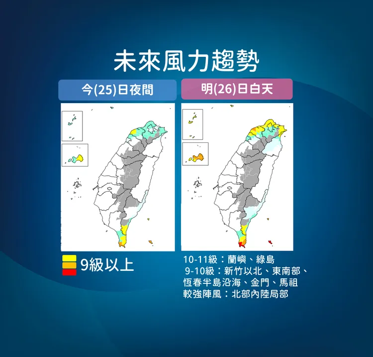 南部風雨則是會在明天會變得更明顯。台東恆春要嚴加戒備強風豪雨,宜蘭花蓮會豪雨不斷,北部馬祖會有強陣風,南部澎湖也會風雨增強,中部則是間歇風雨。