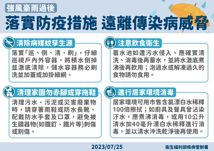 接連2個颱風加上西南風增強帶來豪雨,導致多處積水或淹水。疾管署呼籲,雨後請徹底清除家戶內外輪胎、鐵鋁罐、帆布、寶特瓶、盆栽墊盤等孳生源,降低社區病媒蚊密度及感染登革熱風險。如有出現發燒、頭痛、後眼窩痛、肌肉關節痛、出疹等登革熱疑似症狀,請儘速就醫並主動告知活動史。