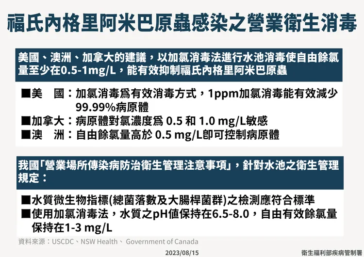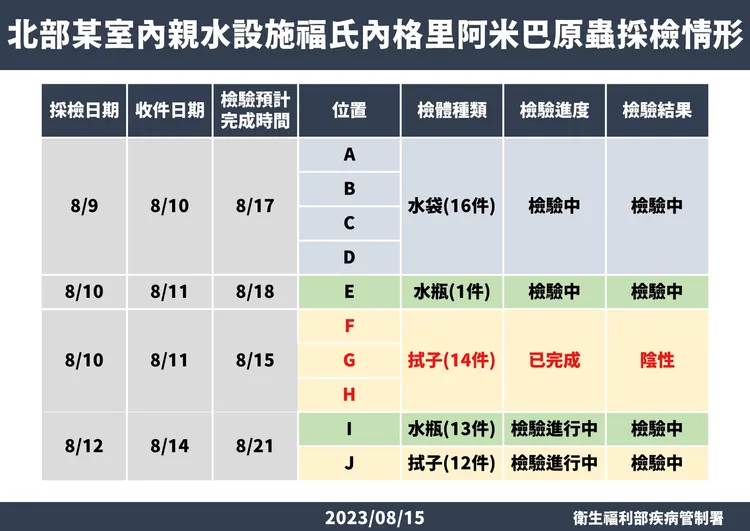 疾管署副署長曾淑慧表示,初步有3處、共14件拭子檢驗結果出爐,福氏阿米巴原蟲檢驗為陰性,剩下的檢體還在檢驗中,結果預計8/17、8/18、8/21出爐,待全部結果出爐才能評估。