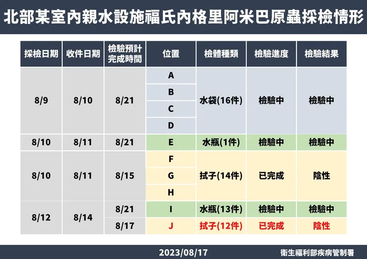 疾管署和新北市衛生局、專家已於8/9、8/10、8/12去新北市某親水設施進行環境採檢,採檢10個位置、總計56件檢體,採檢位置主要在大水池和小水池的出水口、進水口、水池牆面和底部等。