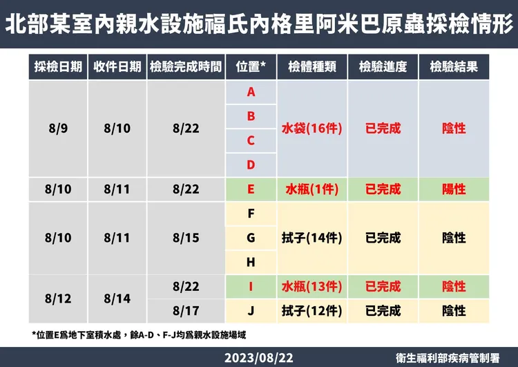 疾管署和新北市衛生局、專家於8/9、8/10、8/12去新北市某親水設施進行環境採檢,採檢10個位置、總計56件檢體,採檢位置主要在大水池和小水池的出水口、進水口、水池牆面和底部等。