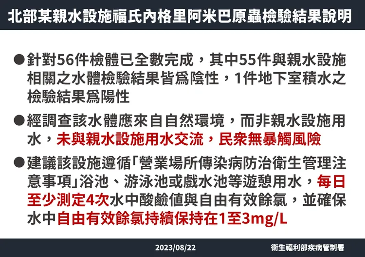 疾管署說明,經調查該陽性水體應來自自然環境,可能是雨水挾帶泥沙造成地下室積水,並非親水設施的用水,未與親水設施用水交流,因此,評估民眾無暴觸風險。