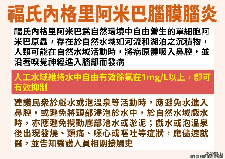 疾管署提醒,籲請民眾於戲水或泡溫泉等活動時,應避免水進入鼻腔,或避免將頭部浸泡於水中,於自然水域戲水時,亦應避免攪動底部池水或淤泥;戲水或泡溫泉後出現發燒、頭痛、噁心或嘔吐等症狀,應儘速就醫,並告知醫護人員相關接觸史。