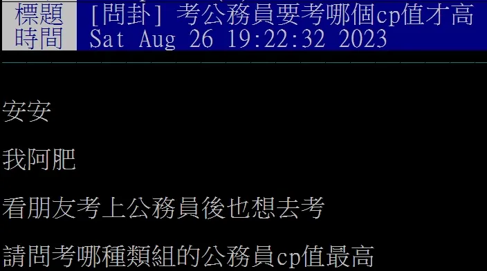 論壇PTT網友發問說,他看朋友考上公務員後也想去考,請問報考哪種類組的公務員CP值最高?警消感覺很累,行政大概會遇到一堆刁民、薪資又不高,技術類一堆肥宅、一日土木終生土城,國營難考,除非技術類賣命。他說,最好是好考 不用輪班跟加班,離家近、錢多,不用第一線面對刁民,辦公室女生又很多一直香香的。