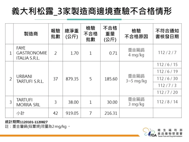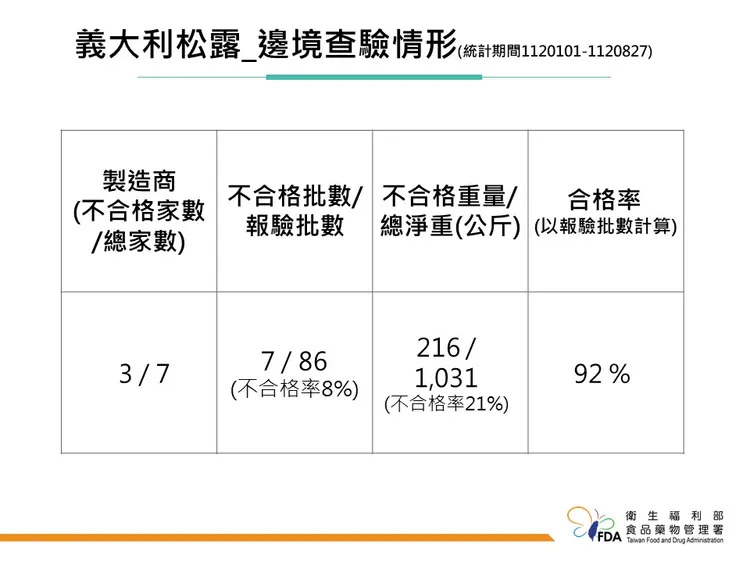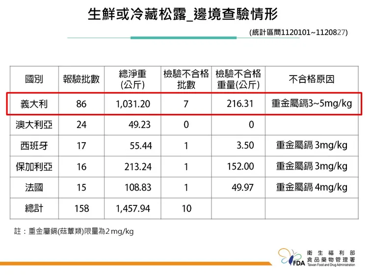 食藥署副署長林金富表示,義大利出口「新鮮夏季黑松露」從今年1月1日至8月27日止,邊境查驗累積7批不合格,總計216公斤,不合格重量佔所有義大利出口新鮮黑松露21%。這7批不合格集中在3家義大利製造廠,原因都是檢出重金屬鎘3~5ppm。