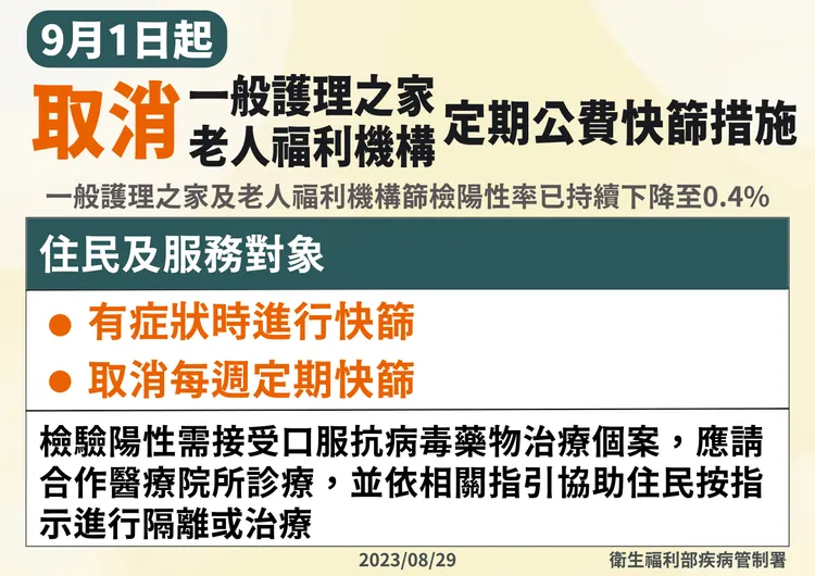 考量COVID-19疫情趨緩,疾管署宣布,一般護理之家及老人福利機構住民陽性率已持續下降至0.4%,因此自今年9月1日起停止定期快篩措施,調整為有症狀時進行快篩,同時回歸長照機構自主防疫,視社區疫情或機構發生群聚時,適時強化健康監測或篩檢措施。