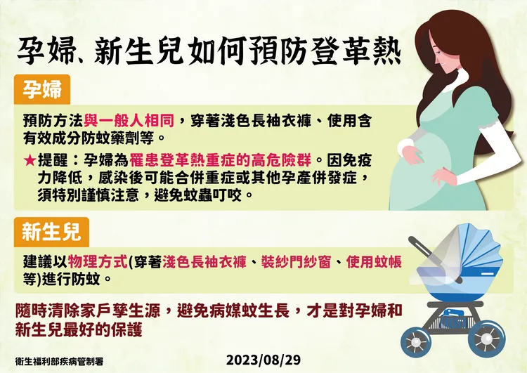 疾管署提醒,研究顯示比起一般孕婦,感染登革熱的孕婦死亡率多出4倍;比起一般新生兒,感染登革熱的新生兒死亡率,高出3倍。保護孕婦及新生兒最有效的方法便是清除家戶內外孳生源並落實防蚊措施;新生兒建議可以物理方式(穿著淺色長袖衣褲、裝紗門紗窗、使用蚊帳等)進行防蚊。