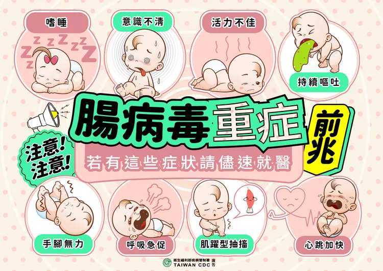 疾管署強調,5歲以下嬰幼兒為腸病毒重症高危險群,如發現有嗜睡、意識不清、活力不佳、手腳無力或麻痺、肌抽躍(無故驚嚇或突然間全身肌肉收縮)、持續嘔吐與呼吸急促或心跳加快等腸病毒重症前兆病徵,請儘速送到大醫院接受治療。