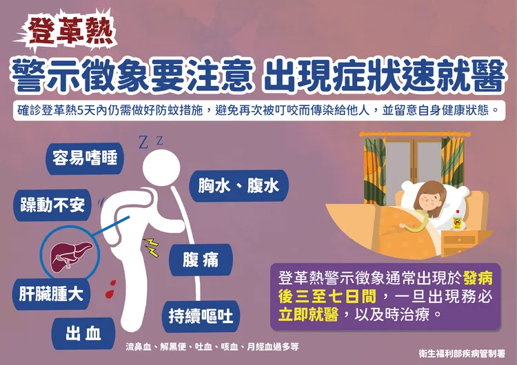 目前社區已出現第一型及第二型登革病毒,曾感染登革熱、年長及高風險族群須持續注意重症警示徵象及出血徵兆。今年累計137例境外移入病例,感染地以東南亞國家為主,以泰國39例、馬來西亞及印尼各21例、越南20例為多。