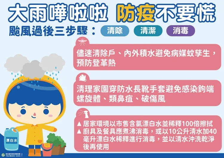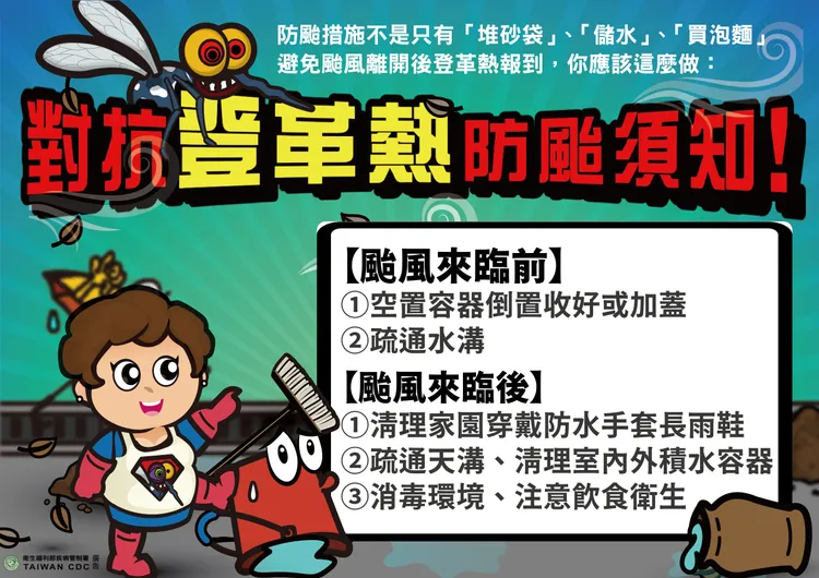 此外,疾管署亦視疫情狀況,每日派遣機動防疫隊至少5組10人至台南、2-4組約4-8人至高雄,協助地方政府進行防治成效及社區風險評估。同時特別呼籲民眾,風災後一周為登革熱防治關鍵期,務必落實「巡、倒、清、刷」。