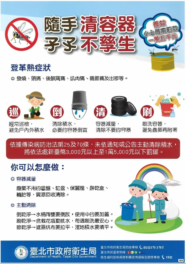 近期各級學校陸續開學,北市衛生局提醒,請學校加強環境孳生源清除,並提醒校職員工生若有出現發燒、頭痛、後眼窩痛、肌肉痛、骨骼痛、關節痛、出疹、腹痛、腹瀉等登革熱症狀,請儘速就醫,並主動告知旅遊史及接觸史。