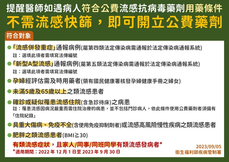 尤其是自身及親友為65歲以上長者、嬰幼兒、高風險慢性病人及孕婦等流感高危險群,應特別留意健康狀況。疾管署同時提醒醫師,如遇病人符合公費流感抗病毒藥劑用藥條件,不需流感快篩,即可開立公費藥劑,以掌握治療黃金時間,降低重症風險。