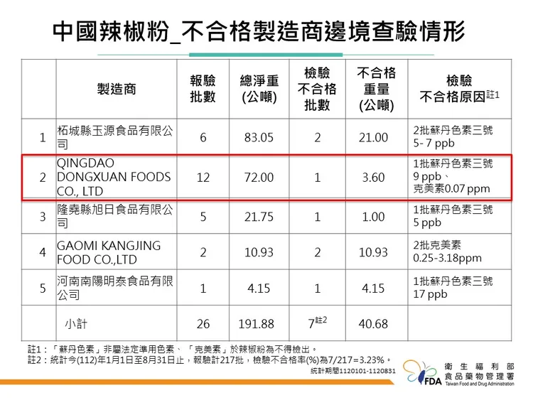 食藥署統計,從今年到目前為止,中國辣椒粉邊境總共報驗217批,其中7批不合格,主要集中在5家中國製造商。因此,林金富宣布,即使起對中國辣椒粉加強管制,邊境查驗提高到50%加強抽批比例,而5家有不合格記錄的製造商拉高到100%逐批抽驗,為期一個月,後續看查驗情形再評估是否調降抽批比例。