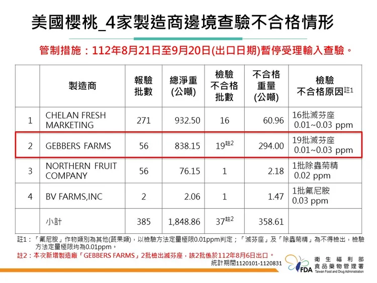 食藥署先前宣布8月21日至9月20止,暫停美國4家鮮櫻桃製造商輸入1個月。食藥署副署長林金富說明,今日公布的2批美國鮮櫻桃邊境查驗不合格,分別檢出殘留農藥滅芬座0.03 ppm、滅芬座0.02 ppm,由新鮮貿易公司進口,均來是美國製造商GEBBERS FARMS,就是暫停輸入的其中一家製造商。