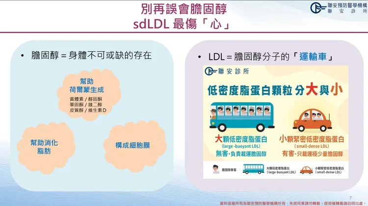 聯安診所心臟血管內科主任施奕仲指出,高密度脂蛋白一般被歸類為好膽固醇,將低密度脂蛋白視為壞膽固醇,其實兩者各有其重要功能。膽固醇並非全然壞東西,除了是荷爾蒙合成的重要成分外,更會幫助消化脂肪、構成身體結構組織如細胞膜等。