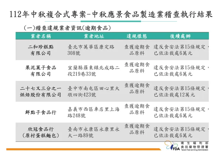 5家貯存逾期食品原料包含台北萬華二和珍糕點、宜蘭果泥菓子食品公司、台中二十七又三分之一烘焙公司、嘉義市鮮點子食品行、台南市欣冠食品行(原村蛋糕麵包),總計開罰36萬元。