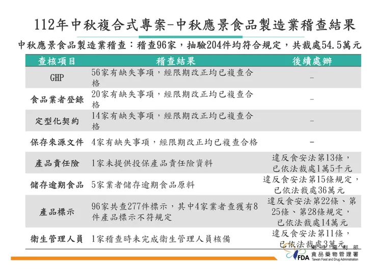 為保障民眾享用中秋應景食品衛生安全,食藥署與地方政府衛生局共同合作執行「112年度中秋複合式專案」,針對中秋節之節慶食品源頭製造業、市售應景食品販售業及餐飲業等加強稽查抽驗。