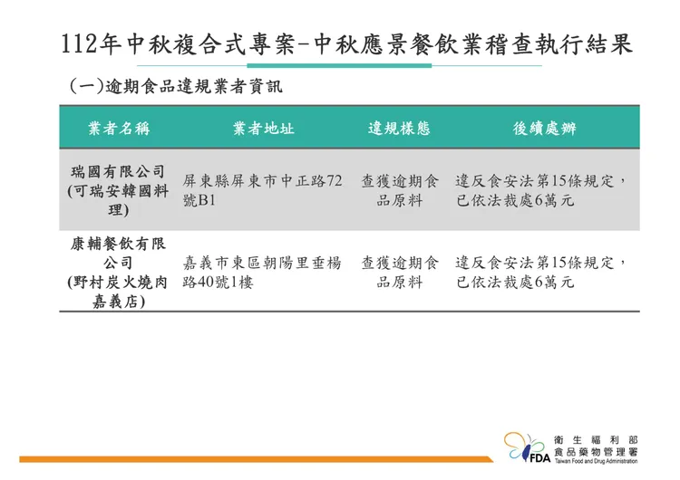 針對燒烤餐廳業者共查核124家,結果有2家業者查獲逾期食品,食藥署南區管理中心主任魏任廷說明,野村炭火燒肉嘉義店查獲貯存20包過期一年的麻糬,有效日期到2022年6月1日,嘉義市衛生局已開罰6萬元。屏東縣可瑞安韓國料理則查獲貯存5包共15公斤過期半年的辣椒粉,有效日期到2023年3月10日,屏東縣衛生局已開罰6萬元。