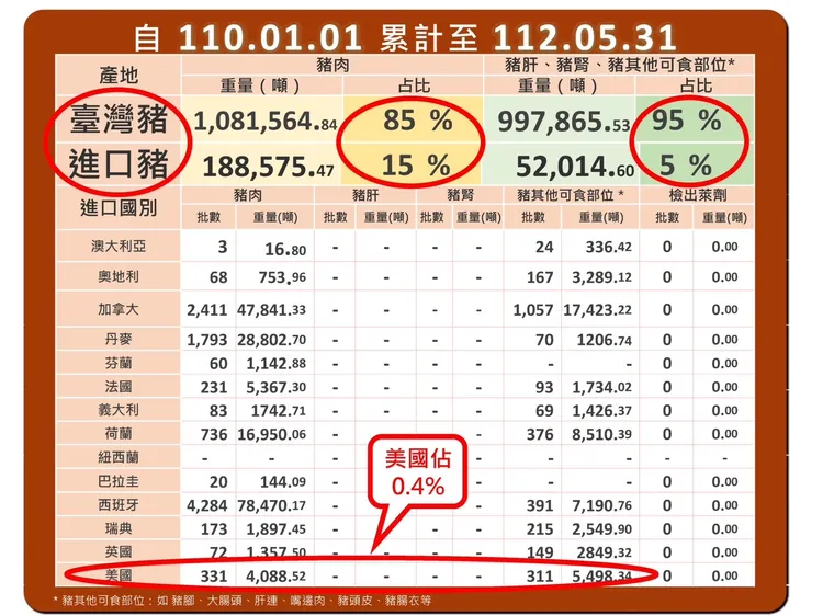 食藥署副署長林金富表示,輸入豬肉均經跨部會機關執行邊境查驗,符合規定後始得輸入,相關豬肉產品進口資訊均於每個工作天公布於「豬肉儀表板」。2021年1月至2023年9月,國產及進口豬肉及其可食部位合計2,636,493公噸,其中美國豬肉為20,728公噸,佔0.8%。