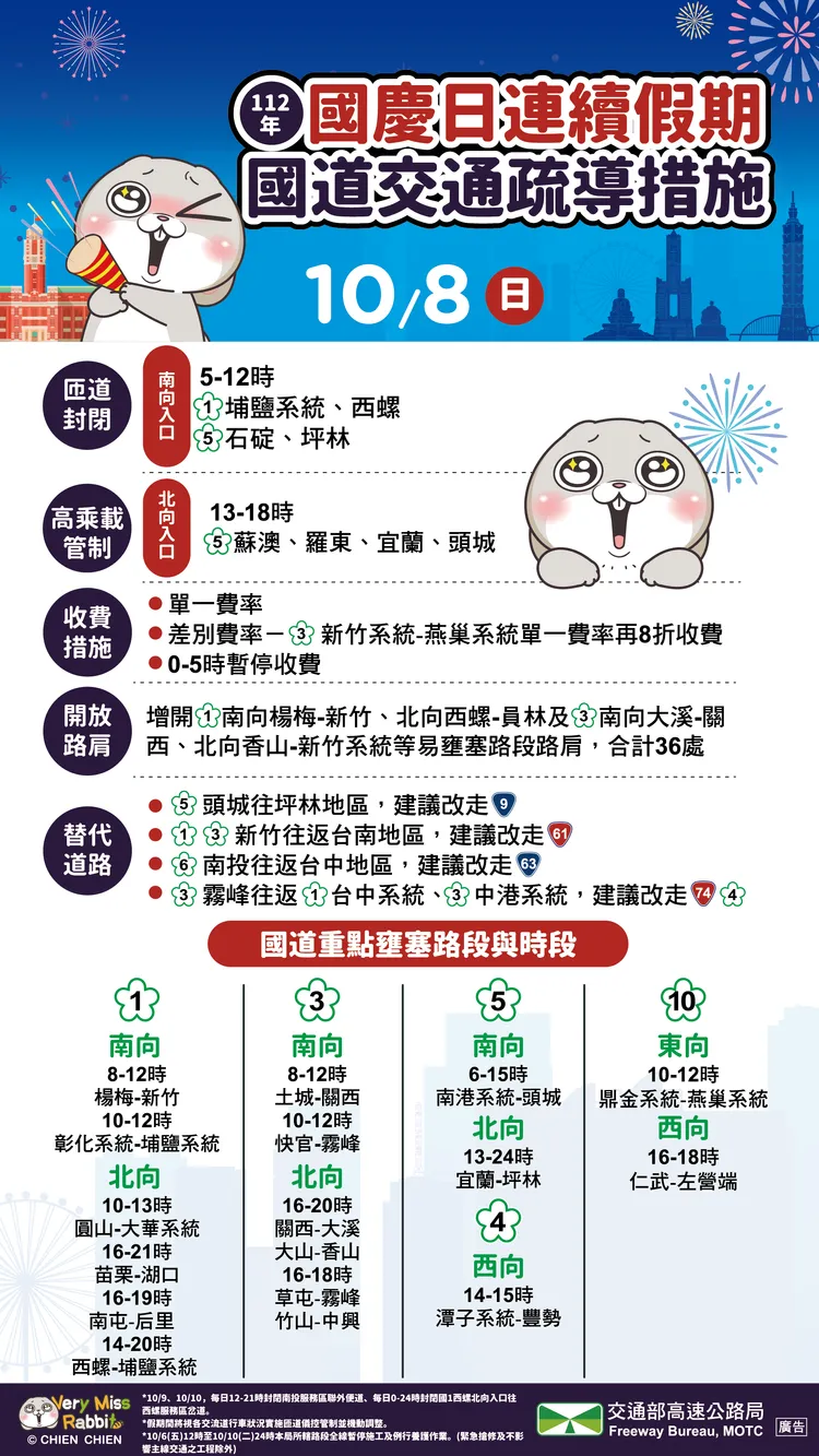 明日國道相關疏導措施包括:5-12時封閉國1埔鹽系統、西螺、國5石碇及坪林南向入口、13-18時國5 蘇澳、羅東、宜蘭及頭城之北向入口高乘載管制、單一費率、0-5時暫停收費、開放路肩、替代道路、匝道儀控等。