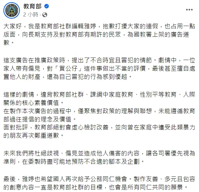 今日上午10點多,教育部粉專發文陳述「大家好,我是教育部社群編輯雅婷,抱歉打擾大家的連假,也占用一點版面,向長期支持及對教育部有期許的民眾,為國教署上架的廣告道歉」,強調該廣告內容對「買公仔」涉不當評價,教育部絕對會虛心檢討改善,並向曾在家庭中遭受此類暴力的朋友再次鄭重道歉等語。