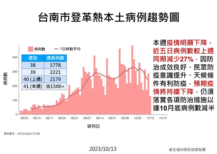 羅一鈞說明,台南市登革熱疫情上週持平略降,從2200多例下降到2180例,這周明顯下降,近五日病例數相較上週同期減少27%,預計這周病例數來到1500-1600例,顯示防治成效良好,社區病媒蚊指數持續下降,民眾防疫意識也提升,很多積水容器都清除,加以最近早晚氣溫明顯轉涼,天候條件有利防疫,預估未來幾周疫情呈下降趨勢。