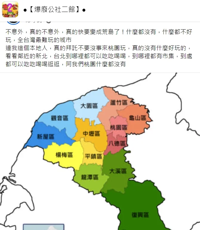 桃園屢被網友封為台灣「旅遊沙漠」、「全台最難玩縣市」,有居民就在臉書「爆廢公社二館」發文表示,不意外,真的不意外,真的快要變成荒島了,什麼都沒有,什麼都不好玩,連他這個本地人都感覺如此,「真的拜託不要沒事來桃園玩,真的沒有什麼好玩的」,鄰近的新北、台北到哪裡都可以吃吃喝喝、有市集、四處逛逛,「啊我們桃園什麼都沒有」。
