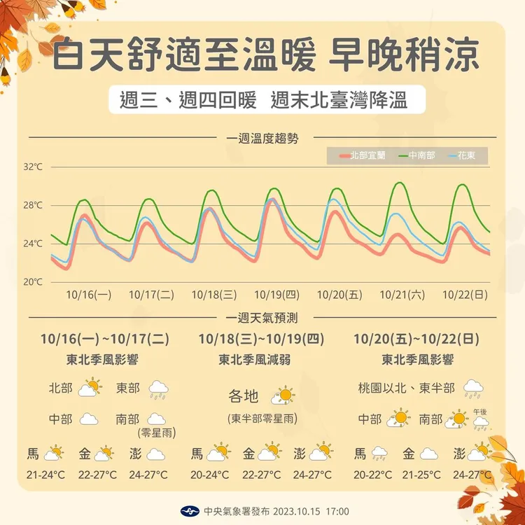 今(10/16)日東北季風影響早晚涼,北部多雲到晴,氣溫約21至28°C,東半部、恆春半島局部短暫雨,氣溫約21-27°C,中部雲量增多,氣溫約22-31°C,南部雲量增有零星雨,氣溫約24-29°C,澎金馬為多雲到晴;桃園至雲林、恆春半島沿海空曠地區及澎湖、金門、蘭嶼易有8至9級強陣風發生的機率。