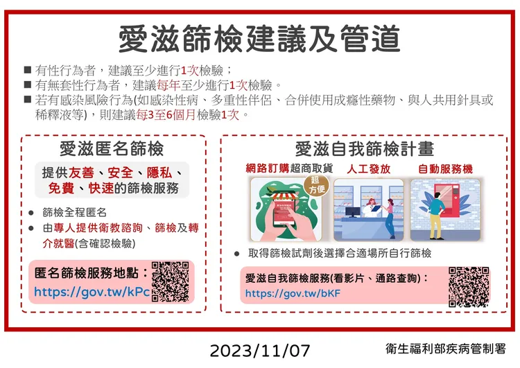 目前全國有82家醫事機構提供愛滋匿名篩檢諮詢服務,篩檢全程以匿名方式進行,並由專人提供衛教諮詢及篩檢;民眾亦可購買愛滋自我篩檢試劑,於家中或適宜的場所進行篩檢。另,接種Mpox疫苗亦同時提供愛滋自我篩檢試劑,請民眾把握機會。