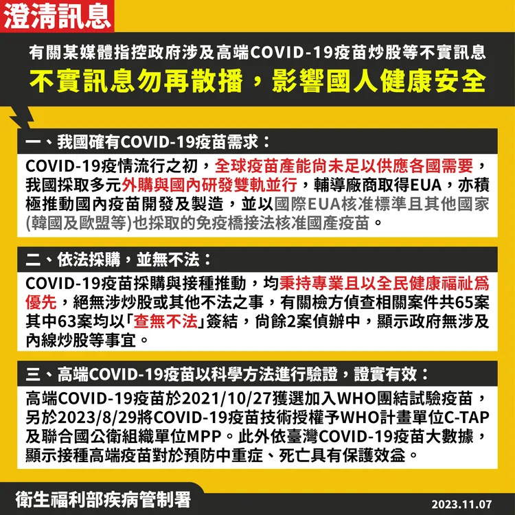 疾管署重申,針對COVID-19疫苗採購與接種推動,均秉持專業且以全民健康福祉為優先,絕無涉炒股或其他不法之事,有關檢方偵查相關案件共63案均以「查無不法」簽結,顯示政府無涉及任何不法情事。