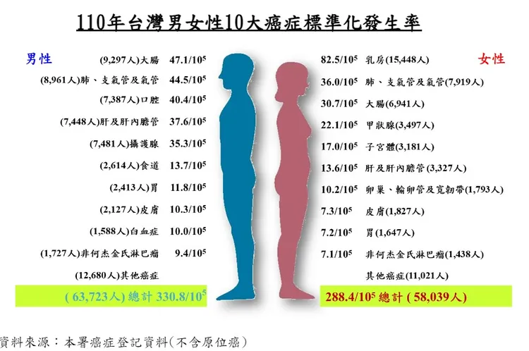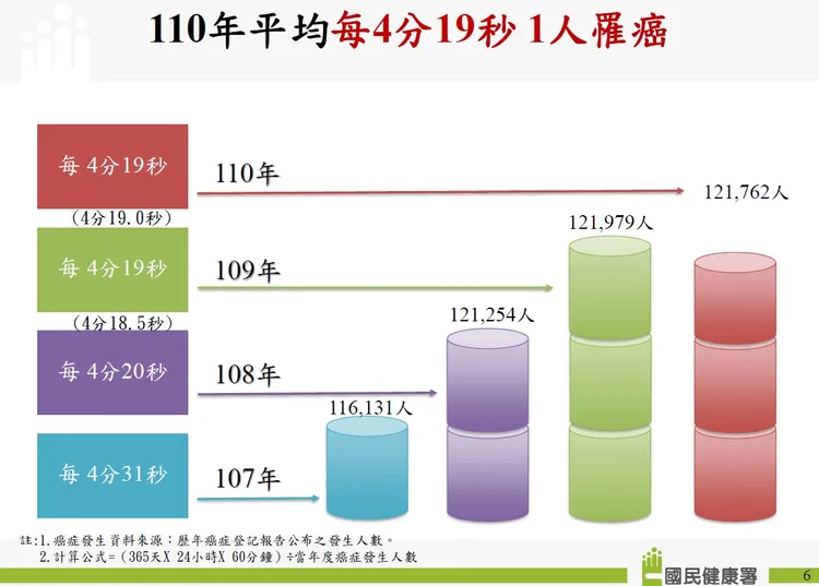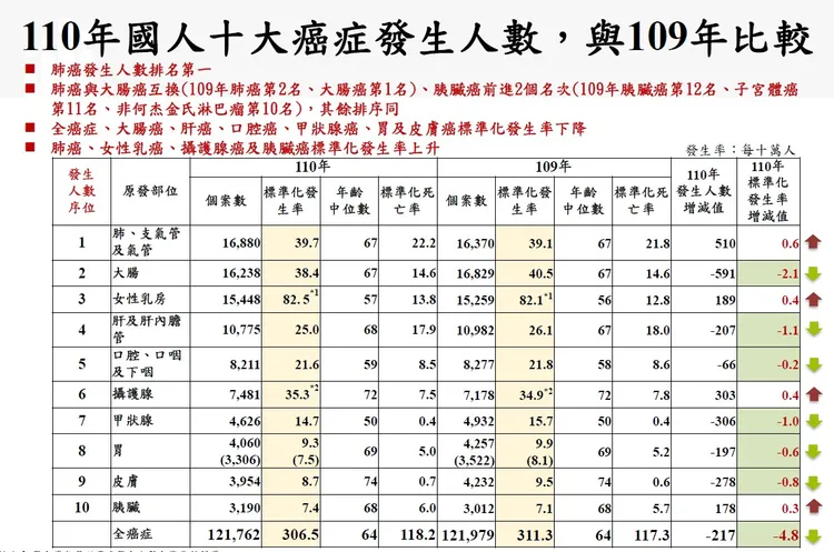 依據最新衛生福利部2021年癌症登記報告,新發生癌症人數為12萬1, 762人,較2020年減少217人,全癌症的標準化發生率為每10萬人口306.5人,較2020年下降4.8人。
