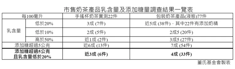 針對包裝奶茶產品(液態),董氏基金會亦至大賣場、超市、超商等處調查共77件,發現近5成產品乳含量低於20% (38件),其中有22件添加奶精,更有2成5產品乳含量乳含量低於10% (20件),幾乎不含乳品。乳含量高於50%的品項只有3成5(27件)。