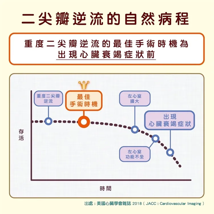 葉集孝表示,早期治療對二尖瓣膜逆流患者長期結果相當重要,拖得愈久,心臟功能愈差,治療風險也愈來愈高。根據目前治療指引,一旦檢查確認二尖瓣重度逆流就是最佳治療時機,如果治療風險可以接受,便可考慮手術治療,否則即使將瓣膜修補好,恐怕也無法完全恢復心臟功能。