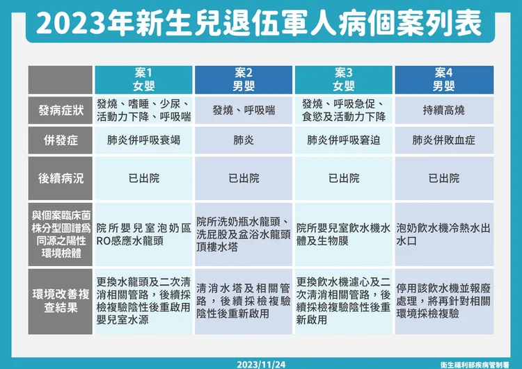 目前4名感染新生兒均已康復出院,另4家院所亦更換或停用相關用水設備,同時進行管路及環境清消與採檢複驗,確認複驗陰性才重啟前述設備。