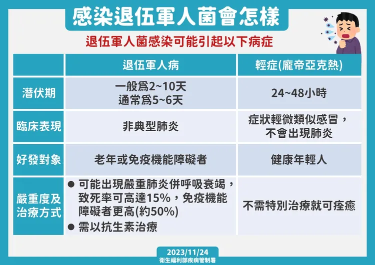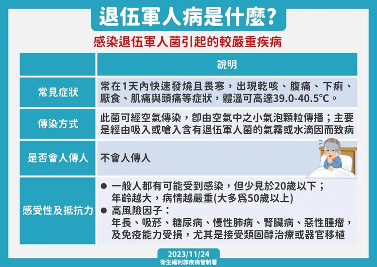 疾管署指出,退伍軍人病為感染退伍軍人菌引起的較嚴重疾病,退伍軍人菌普遍存在於天然及人工水體環境中,主要是經由吸入或嗆入含有退伍軍人菌的氣霧或水滴因而致病,不會以人傳人方式傳播,但致病性與人體免疫狀況相關,高風險族群包括年長、吸菸、慢性病(如糖尿病、慢性肺病、腎臟病、惡性腫瘤等)或其他免疫低下者等,新生兒感染較為少見。
