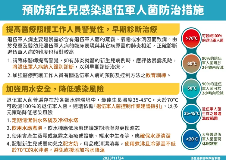 依據國際間相關文獻,新生兒感染退伍軍人菌的途徑主要是暴露於會產生蒸霧或氣霧之治療或設施、經水中生產、嗆入或吸入污染的水等途徑感染,若發生肺炎其臨床表現與其它病原菌引發的症狀相近,鑑別診斷難度較高,因此也請臨床醫師提高警覺,如遇新生兒肺炎個案時,應評估暴露風險,將退伍軍人病納入鑑別診斷,以利早期診斷治療。
