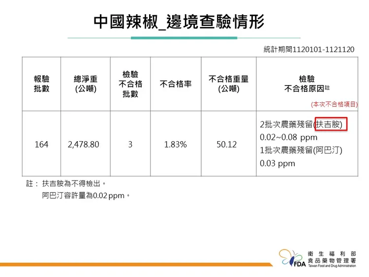 今日還有一批中國輸入的「辣椒」被檢出殘留農藥氟吉安0.02 ppm超標,17,700公斤不合格產品依規定退運或銷毀,進口商瑋鏻有限公司由加強抽批調整為逐批查驗。食藥署統計,今年1月1日到11月20日止,中國輸入的辣椒報驗批數為164批,檢驗不合格3批,不合格率為1.83%,不合格原因主要是被檢出農藥殘留扶吉胺、阿巴汀等。