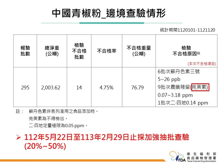 食藥署統計,自今年1月1日到11月20日止,在邊境受理中國輸入的青椒粉總共有295批,檢驗不合格批數為14批,不合格率為4.75%。不合格原因分別為檢出蘇丹色素三號、農藥殘留克美素、以及二.四地。食藥署從今年5月22日到明年2月底止,對於中國輸入的青椒粉採加強抽批查驗。