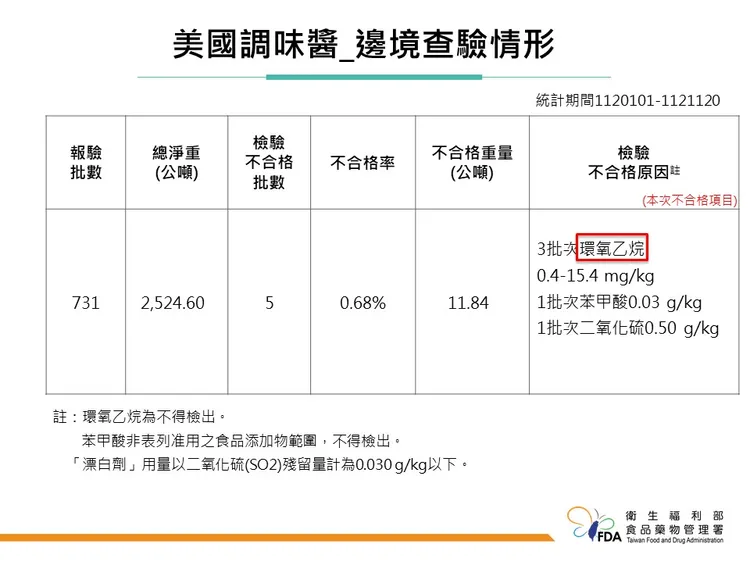 食藥署副署長林金富說明,這是星期五公司最近六個月來第一次不合格,邊境從一般抽批調整為加強抽批。統計今年1月1日至11月20日止,自美國輸入的調味醬報驗批數為731批,檢驗不合格5批,不合格率0.68%,不合格原因分別為農藥殘留環氧乙烷、防腐劑苯甲酸超標以及漂白劑二氧化硫超標。