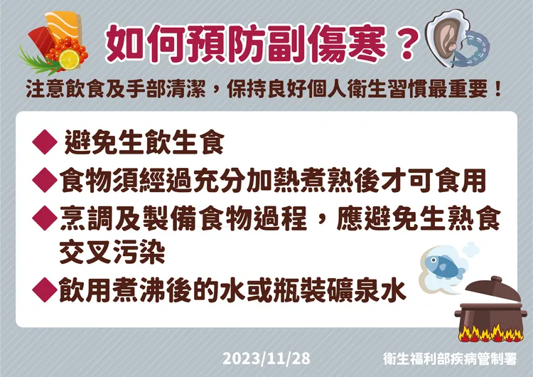 疾管署副署長羅一鈞說明,依據例行疫調資料顯示,今年22例本土副傷寒確定病例,其中5例曾經烤蚵、2例吃生蠔,其餘曾吃生蝦、生魚片及生干貝等。同住或共食之接觸者皆完成採檢,檢驗結果均為陰性。