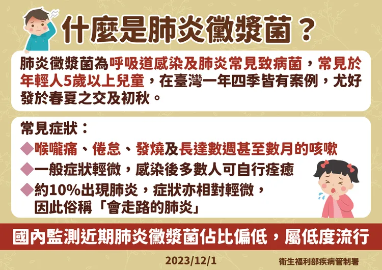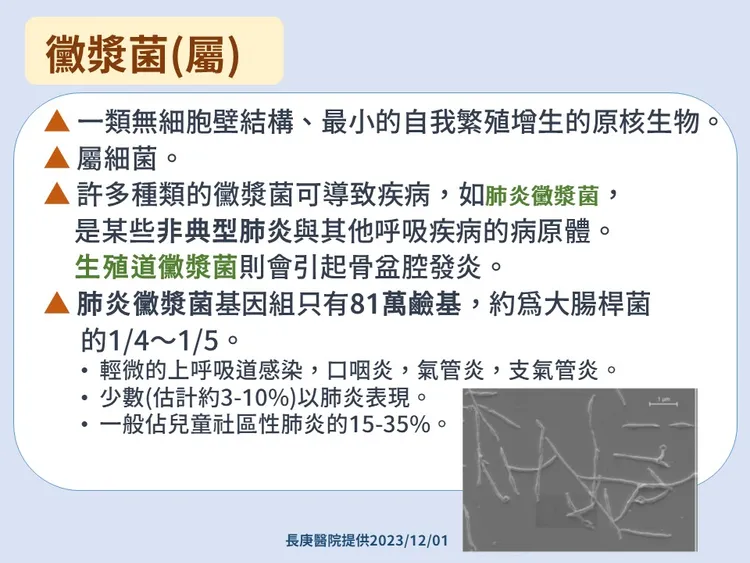林口長庚兒童感染科教授及主治醫師黃玉成表示,黴漿菌大多是上呼吸道感染,例如口咽炎、氣管炎、支氣管炎,跟病毒一樣,症狀治療後就可以好轉,不需要特別使用抗生素也能自行痊癒,只有3-10%的黴漿菌病人會出現肺炎。