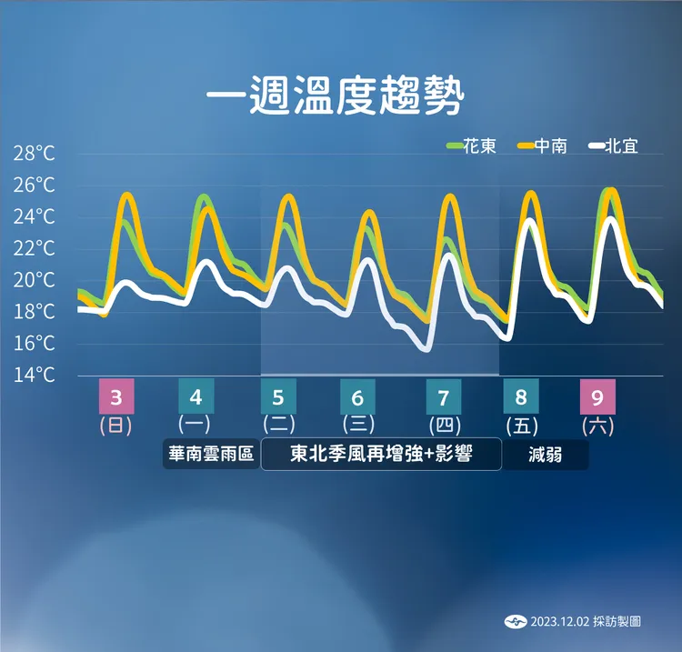 週二(12/5)東北季風增強,北部及東北部天氣轉涼;週三、週四(12/6、7)東北季風影響,北部及東北部整天較涼,其他地區早晚亦涼;週二、週三迎風面水氣偏多,北部、東半部地區及中南部山區有局部短暫雨,其他地區為多雲到晴。