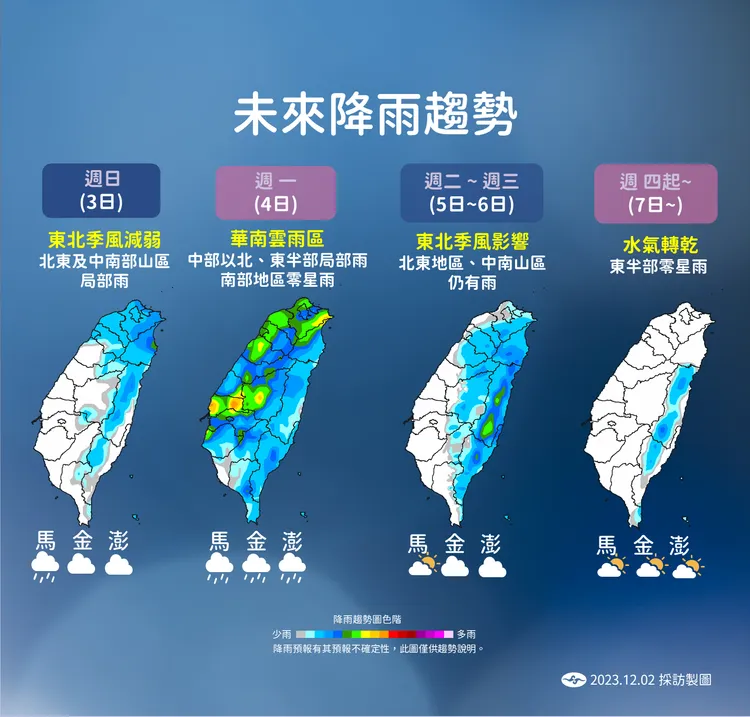 週四大氣轉乾,水氣減少,各地為多雲到晴,僅東半部地區有零星短暫雨。週五、週六(12/8、12/9)東北季風減弱,各地大多為晴到多雲,僅東半部地區有零星短暫雨。